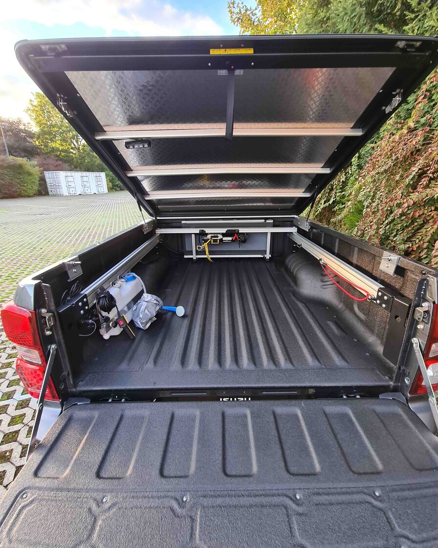 Der Aufbau verfügt zudem über einen Seilwindenträger und eine klappbare Rampe aus Aluminium sowie eine Wildwanne. Ein montierter Arbeitsscheinwerfer leuchtet den Laderaum und die Umgebung optimal aus. Auch für die mobile Wasserversorgung auf der Jagd ist gesorgt: Dafür sind eine 12 Volt Brause sowie ein 12 Liter Kanister integriert. Der Deckel des Jägeraufbaus besteht aus leichtem, stabilem Aluminium mit Riffelblechoberfläche. Rockslider an den Seiten dienen dem Offroad-Schutz des Fahrzeugs.